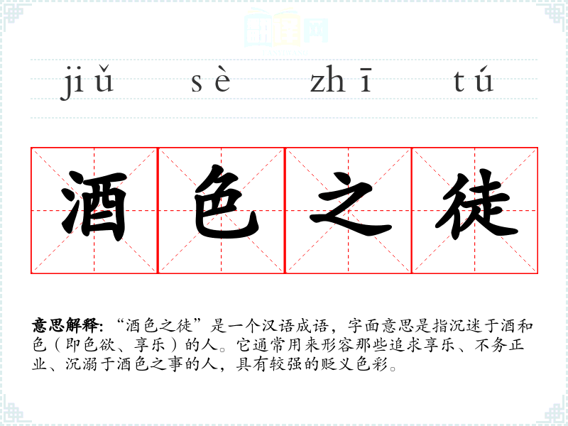 “酒色之徒”是一个汉语成语,字面意思是指沉迷于酒和色(即色欲、享乐)的人。它通常用来形容那些追求享乐、不务正业、沉溺于酒色之事的人,具有较强的贬义色彩。