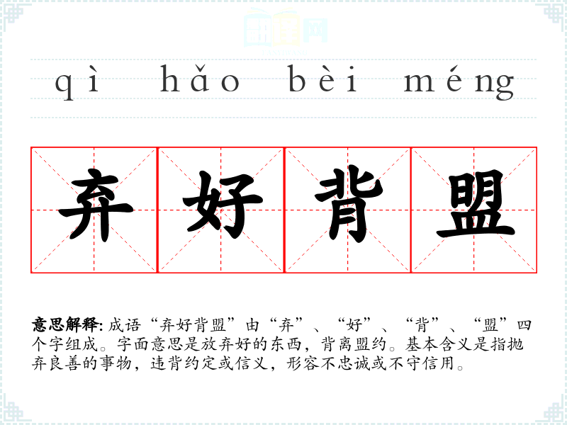 成语“弃好背盟”由“弃”、“好”、“背”、“盟”四个字组成。字面意思是放弃好的东西,背离盟约。基本含义是指抛弃良善的事物,违背约定或信义,形容不忠诚或不守信用。