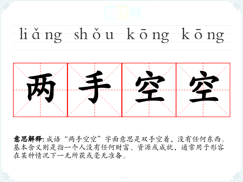 成语“两手空空”字面意思是双手空着,没有任何东西。基本含义则是指一个人没有任何财富、资源或成就,通常用于形容在某种情况下一无所获或毫无准备。