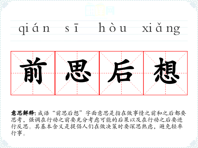 “前思后想”并没有特定的历史典故或文学出处,它的构成和意义反映了**传统文化中重视思考与反省的价值观。这一成语强调理性思维和周全考虑的重要性,符合儒家思想中的“慎独”原则。