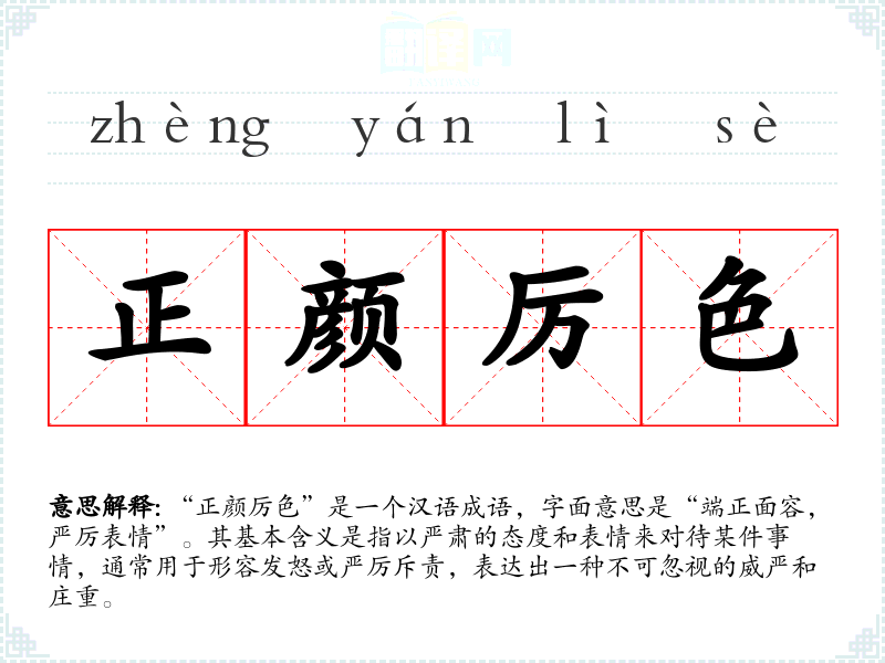 “正颜厉色”是一个汉语成语,字面意思是“端正面容,严厉表情”。其基本含义是指以严肃的态度和表情来对待某件事情,通常用于形容发怒或严厉斥责,表达出一种不可忽视的威严和庄重。