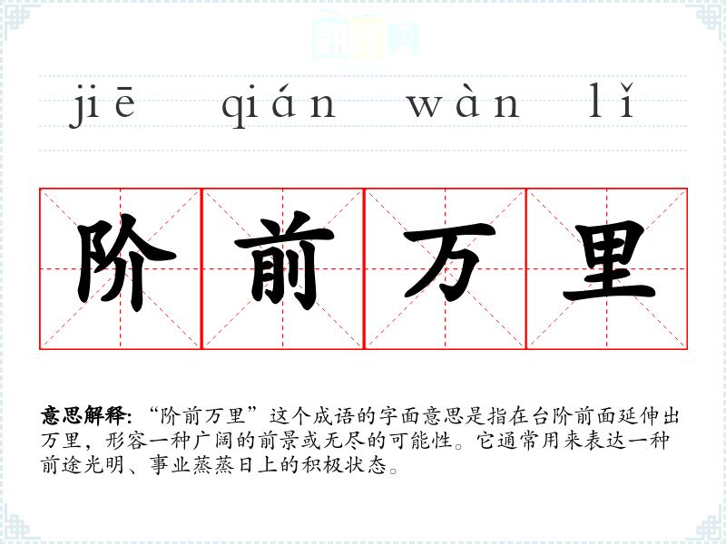 “阶前万里”这个成语的字面意思是指在台阶前面延伸出万里,形容一种广阔的前景或无尽的可能性。它通常用来表达一种前途光明、事业蒸蒸日上的积极状态。