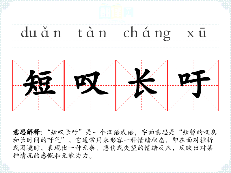 “短叹长吁”是一个汉语成语,字面意思是“短暂的叹息和长时间的吁气”。它通常用来形容一种情绪状态,即在面对挫折或困境时,表现出一种无奈、悲伤或失望的情绪反应,反映出对某种情况的感慨和无能为力。