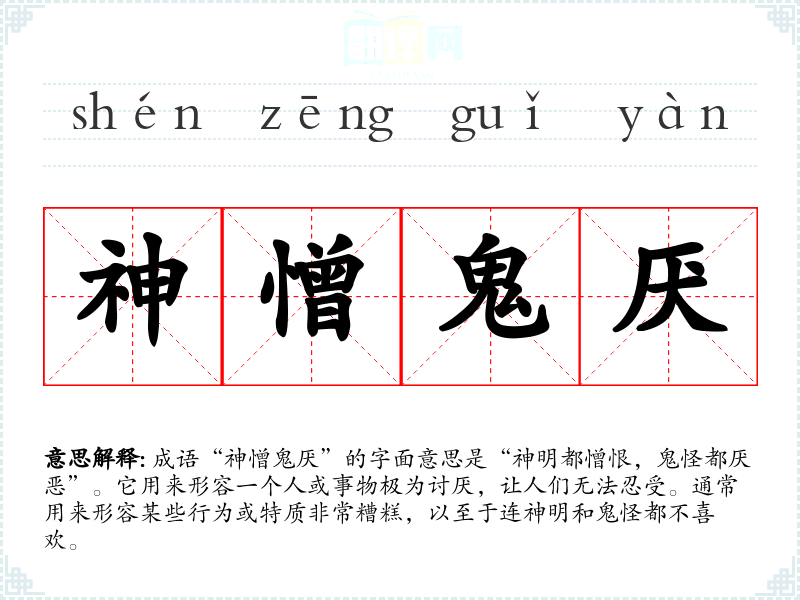 成语“神憎鬼厌”的字面意思是“神明都憎恨,鬼怪都厌恶”。它用来形容一个人或事物极为讨厌,让人们无法忍受。通常用来形容某些行为或特质非常糟糕,以至于连神明和鬼怪都不喜欢。