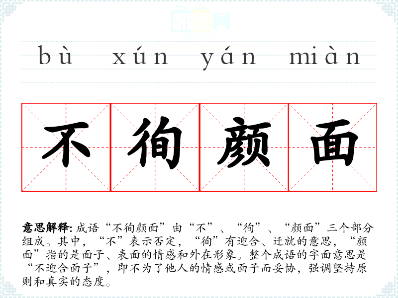 成语“不徇颜面”由“不”、“徇”、“颜面”三个部分组成。其中,“不”表示否定,“徇”有迎合、迁就的意思,“颜面”指的是面子、表面的情感和外在形象。整个成语的字面意思是“不迎合面子”,即不为了他人的情感或面子而妥协,强调坚持原则和真实的态度。