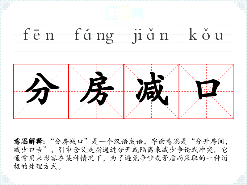 在不同文化中,类似的表达可能存在。例如,在英语中,“to avoid conflict”可以表达类似的意思,但通常没有“分房减口”这种具体化的形象表达。这反映出不同文化在处理人际关系矛盾时的差异。