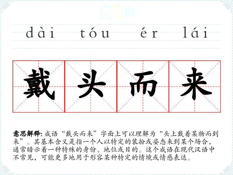 成语“戴头而来”字面上可以理解为“头上戴着某物而到来”。其基本含义是指一个人以特定的装扮或姿态来到某个场合,通常暗示着一种特殊的身份、地位或目的。这个成语在现代汉语中不常见,可能更多地用于形容某种特定的情境或情感表达。