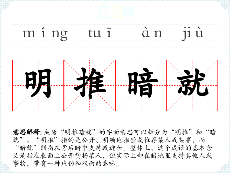 成语“明推暗就”的字面意思可以拆分为“明推”和“暗就”。“明推”指的是公开、明确地推崇或推荐某人或某事,而“暗就”则指在背后暗中支持或迎合。整体上,这个成语的基本含义是指在表面上公开赞扬某人,但实际上却在暗地里支持其他人或事物,带有一种虚伪和双面的意味。
