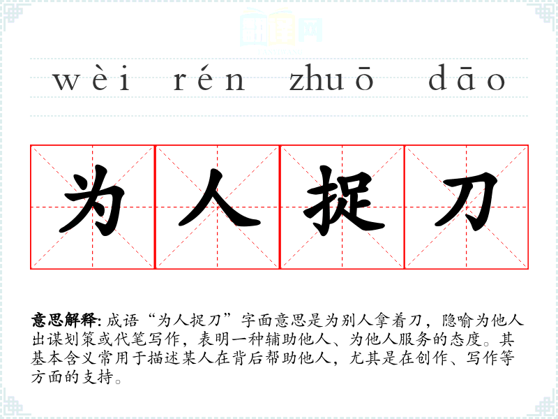 成语“为人捉刀”字面意思是为别人拿着刀,隐喻为他人出谋划策或代笔写作,表明一种辅助他人、为他人服务的态度。其基本含义常用于描述某人在背后帮助他人,尤其是在创作、写作等方面的支持。