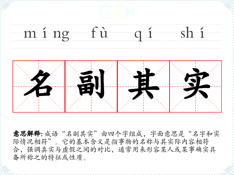 成语“名副其实”由四个字组成,字面意思是“名字和实际情况相符”。它的基本含义是指事物的名称与其实际内容相符合,强调真实与虚假之间的对比,通常用来形容某人或某事确实具备所称之的特征或性质。