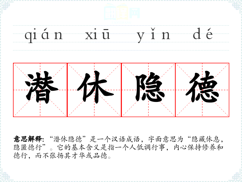 “潜休隐德”是一个汉语成语,字面意思为“隐藏休息,隐匿德行”。它的基本含义是指一个人低调行事,内心保持修养和德行,而不张扬其才华或品德。