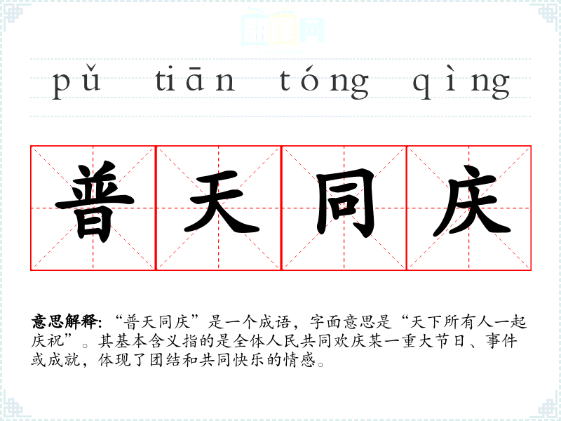 “普天同庆”是一个成语,字面意思是“天下所有人一起庆祝”。其基本含义指的是全体人民共同欢庆某一重大节日、**或成就,体现了团结和共同快乐的情感。