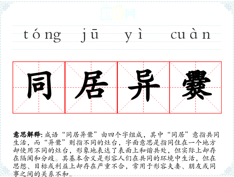 成语“同居异爨”由四个字组成,其中“同居”意指共同生活,而“异爨”则指不同的灶台,字面意思是指同住在一个地方却使用不同的灶台,形象地表达了表面上和谐共处,但实际上却存在隔阂和分歧。其基本含义是形容人们在共同的环境中生活,但在思想、目标或利益上却存在严重不合,常用于形容夫妻、朋友或同事之间的关系不和。