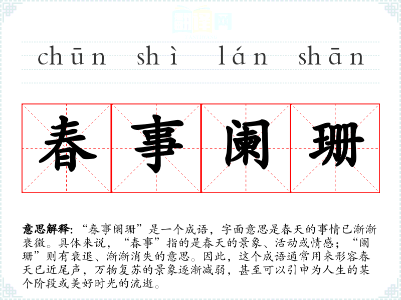 在**文化中,春天象征着新的开始与希望,而“春事阑珊”则提醒人们珍惜美好时光,反思时间的流逝。在现代社会,面对快节奏的生活,这个成语也鼓励人们停下来,欣赏身边的美好,反思过去的经历。
