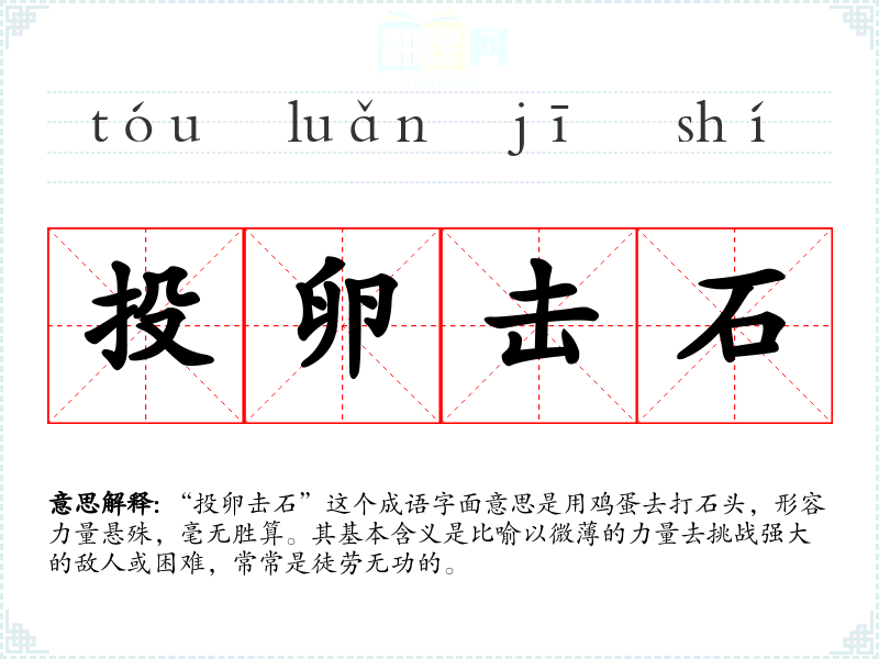 “投卵击石”这个成语字面意思是用鸡蛋去打石头,形容力量悬殊,毫无胜算。其基本含义是比喻以微*的力量去挑战强大的敌人或困难,常常是徒劳无功的。