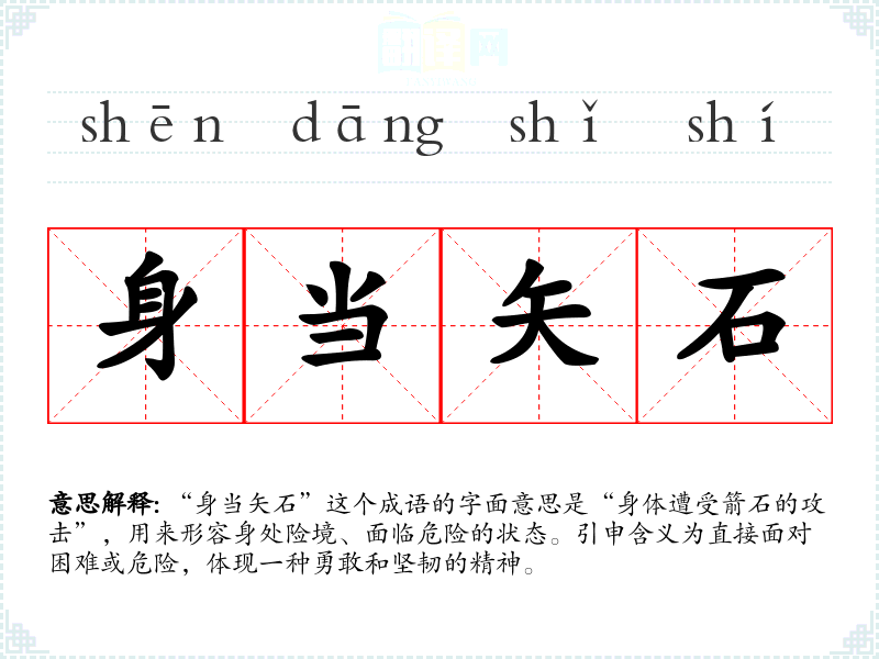 “身当矢石”这个成语的字面意思是“身体遭受箭石的攻击”,用来形容身处险境、面临危险的状态。引申含义为直接面对困难或危险,体现一种勇敢和坚韧的精神。