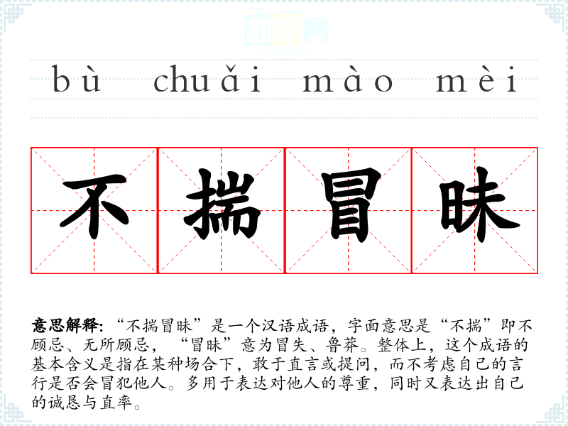 “不揣冒昧”是一个汉语成语,字面意思是“不揣”即不顾忌、无所顾忌, “冒昧”意为冒失、鲁莽。整体上,这个成语的基本含义是指在某种场合下,敢于直言或提问,而不考虑自己的言行是否会冒犯他人。多用于表达对他人的尊重,同时又表达出自己的诚恳与直率。