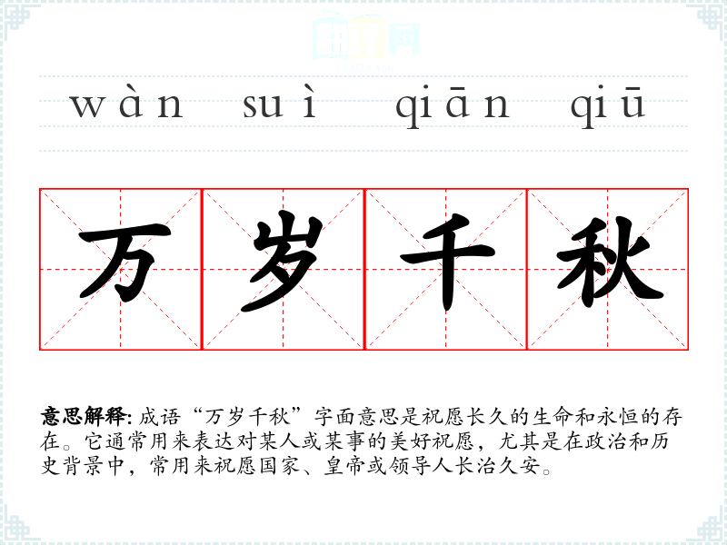 “万岁千秋”这一成语的来源可以追溯到古代的帝王文化。在古代,的统治和国家的繁荣常常与长寿和长久相联系。历史上,臣民在庆祝的生日或升迁时,常用“万岁”来祝贺,意指统治的时间长久。成语的使用在《诗经》、《史记》等古代典籍中均有体现,逐渐演变为对国家和领导人祝福的常用语。
