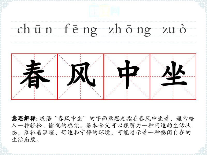“春风中坐”并没有明确的历史典故或文学出处,可能是由春风这一自然现象引申而来。春风在**文化中常常象征着温暖、新生和美好的时光,因此这一成语可能是在描述春天的美好氛围与舒适的生活状态。