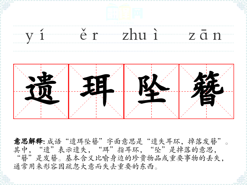 在**传统文化中,物品的遗失常常被视为一种不幸或疏忽,尤其是对于具有情感价值的物品。因此,“遗珥坠簪”不仅仅是对物质的惋惜,也反映了人们对情感和人际关系的重视。在现代社会,这种对失去的反思依然适用,提醒人们珍惜身边的一切。