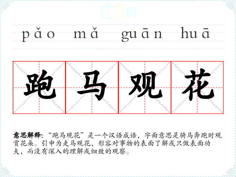 “跑马观花”是一个汉语成语,字面意思是骑马奔跑时观赏花朵。引申为走马观花,形容对事物的表面了解或只做表面功夫,而没有深入的理解或细致的观察。