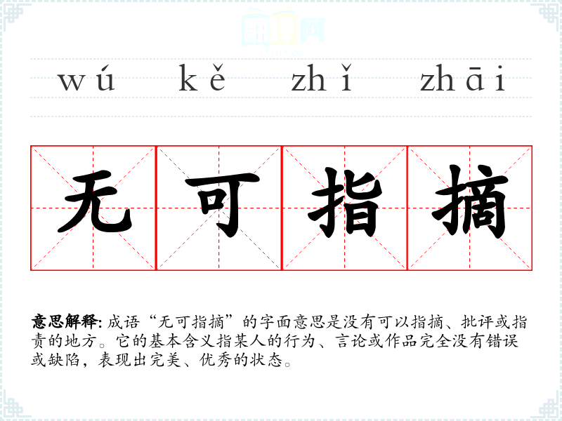 成语“无可指摘”的字面意思是没有可以指摘、批评或指责的地方。它的基本含义指某人的行为、言论或作品完全没有错误或缺陷,表现出完美、优秀的状态。