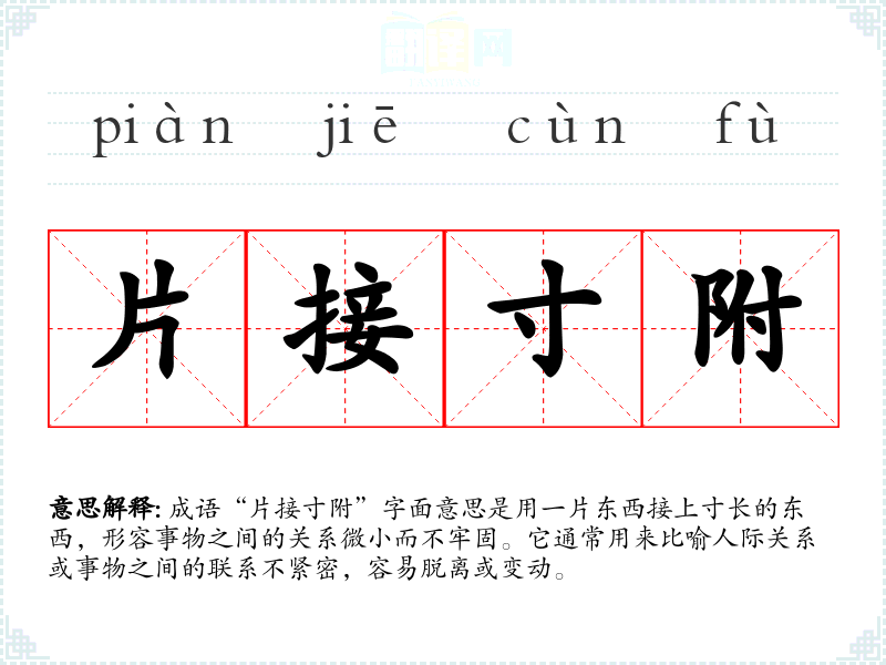 成语“片接寸附”字面意思是用一片东西接上寸长的东西,形容事物之间的关系微小而不牢固。它通常用来比喻人际关系或事物之间的联系不紧密,容易脱离或变动。