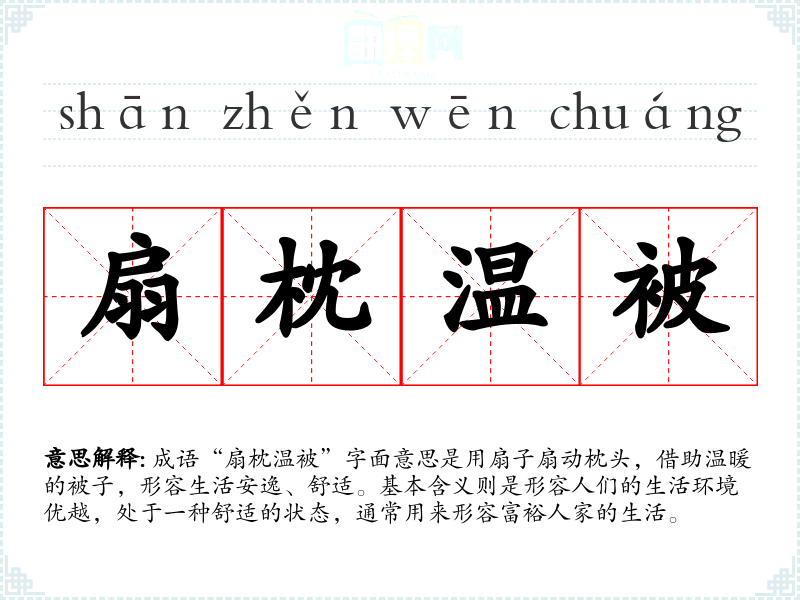 - 反义成语:寒窗苦读,饥寒交迫。前者强调艰苦奋斗,后者则指生活困苦,与“扇枕温被”的安逸正好相反。