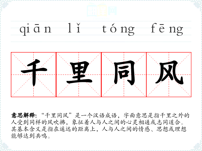 “千里同风”是一个汉语成语,字面意思是指千里之外的人受到同样的风吹拂,象征着人与人之间的心灵相通或志同道合。其基本含义是指在遥远的距离上,人与人之间的情感、思想或理想能够达到共鸣。