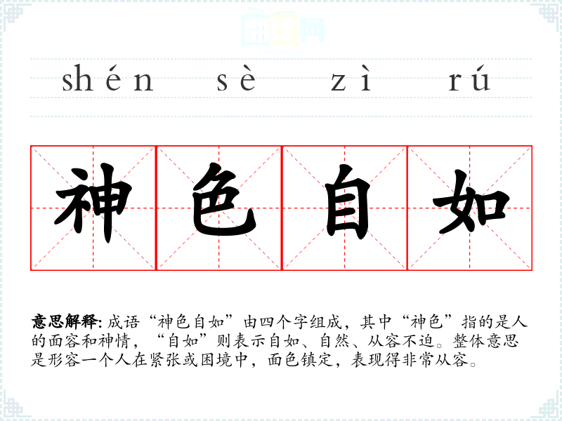 成语“神色自如”由四个字组成,其中“神色”指的是人的面容和神情,“自如”则表示自如、自然、从容不迫。整体意思是形容一个人在紧张或困境中,面色镇定,表现得非常从容。