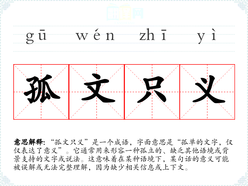 “孤文只义”并没有明确的历史背景和典故,它的构造是通过对汉字的组合而形成的。这个成语可以被视为一种对语言使用的批判,强调在交流中上下文的重要性。
