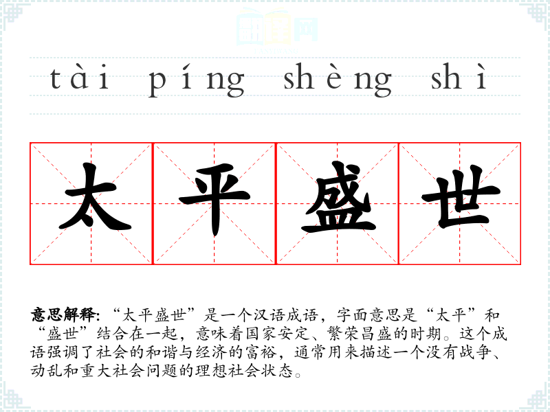 “太平盛世”是一个汉语成语,字面意思是“太平”和“盛世”结合在一起,意味着国家安定、繁荣昌盛的时期。这个成语强调了社会的和谐与经济的富裕,通常用来描述一个没有战争、动乱和重大社会问题的理想社会状态。