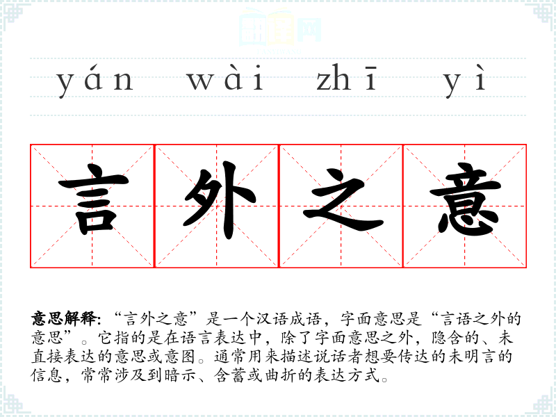 “言外之意”是一个汉语成语,字面意思是“言语之外的意思”。它指的是在语言表达中,除了字面意思之外,隐含的、未直接表达的意思或意图。通常用来描述说话者想要传达的未明言的信息,常常涉及到暗示、含蓄或曲折的表达方式。