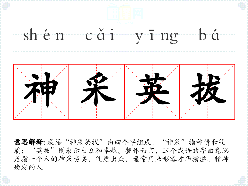 成语“神采英拔”由四个字组成:“神采”指神情和气质;“英拔”则表示出众和卓越。整体而言,这个成语的字面意思是指一个人的神采奕奕,气质出众,通常用来形容才华横溢、精神焕发的人。
