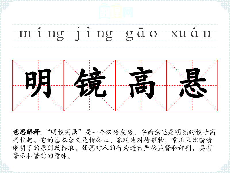 “明镜高悬”是一个汉语成语,字面意思是明亮的镜子高高挂起。它的基本含义是指公正、客观地对待事物,常用来比喻清晰明了的原则或标准,强调对人的行为进行严格监督和评判,具有警示和警觉的意味。