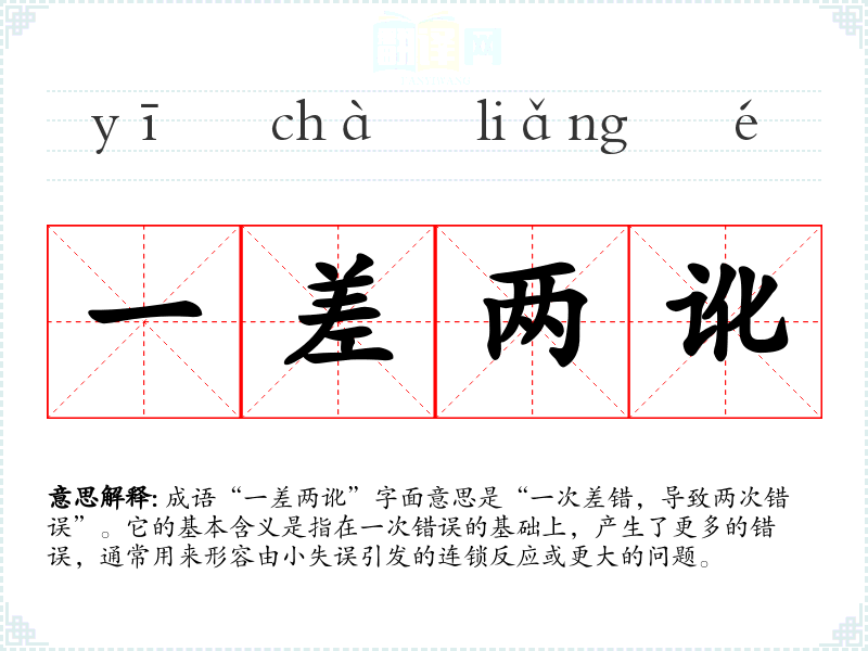 成语“一差两讹”字面意思是“一次差错,导致两次错误”。它的基本含义是指在一次错误的基础上,产生了更多的错误,通常用来形容由小失误引发的连锁反应或更大的问题。
