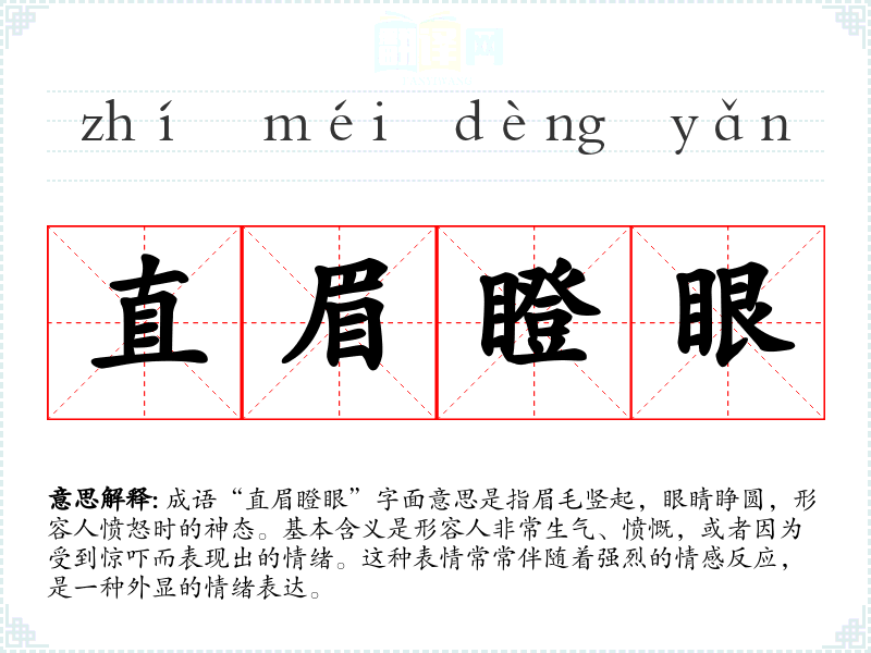 成语“直眉瞪眼”字面意思是指眉毛竖起,眼睛睁圆,形容人愤怒时的神态。基本含义是形容人非常生气、愤慨,或者因为受到惊吓而表现出的情绪。这种表情常常伴随着强烈的情感反应,是一种外显的情绪表达。