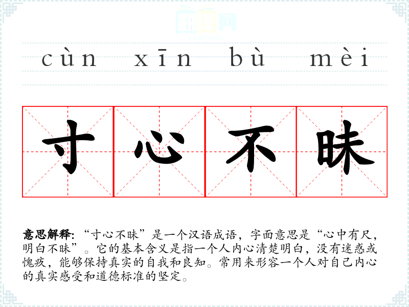 “寸心不昧”是一个汉语成语,字面意思是“心中有尺,明白不昧”。它的基本含义是指一个人内心清楚明白,没有迷惑或愧疚,能够保持真实的自我和良知。常用来形容一个人对自己内心的真实感受和道德标准的坚定。