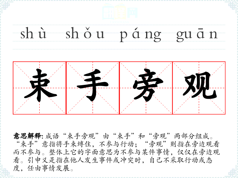 成语“束手旁观”由“束手”和“旁观”两部分组成。“束手”意指将手束缚住,不参与行动;“旁观”则指在旁边观看而不参与。整体上它的字面意思为不参与某件事情,仅仅在旁边观看。引申义是指在他人发生**或冲突时,自己不采取行动或态度,任由事情发展。