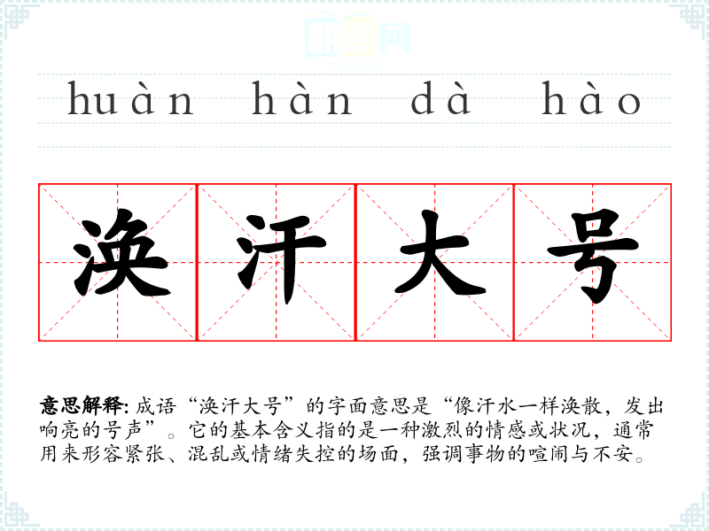 成语“涣汗大号”的字面意思是“像汗水一样涣散,发出响亮的号声”。它的基本含义指的是一种激烈的情感或状况,通常用来形容紧张、混乱或情绪失控的场面,强调事物的喧闹与不安。
