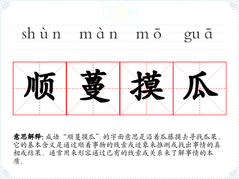成语“顺蔓摸瓜”的字面意思是沿着瓜藤摸去寻找瓜果。它的基本含义是通过顺着事物的线索或迹象来推测或找出事情的真相或结果。通常用来形容通过已有的线索或关系来了解事情的本质。
