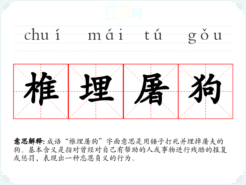 成语“椎埋屠狗”字面意思是用锤子打死并埋掉屠夫的狗。基本含义是指对曾经对自己有帮助的人或事物进行残酷的报复或惩罚,表现出一种忘恩负义的行为。