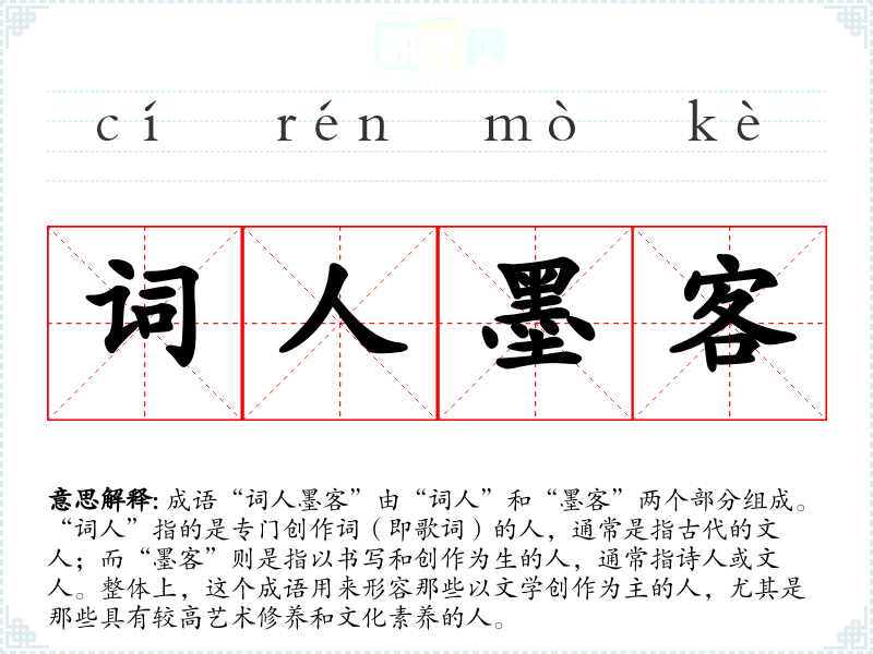 成语“词人墨客”由“词人”和“墨客”两个部分组成。“词人”指的是专门创作词(即歌词)的人,通常是指古代的文人;而“墨客”则是指以书写和创作为生的人,通常指诗人或文人。整体上,这个成语用来形容那些以文学创作为主的人,尤其是那些具有较高艺术修养和文化素养的人。