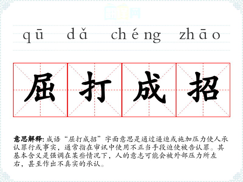 成语“屈打成招”字面意思是通过逼迫或施加压力使人承认罪行或事实,通常指在审讯中使用不正当手段迫使被告认罪。其基本含义是强调在某些情况下,人的意志可能会被外部压力所左右,甚至作出不真实的承认。