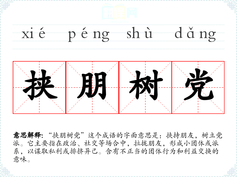“挟朋树党”这个成语的字面意思是:挟持朋友,树立党派。它主要指在政治、社交等场合中,拉拢朋友,形成小团体或派系,以谋取私利或排挤异己。含有不正当的团体行为和利益交换的意味。