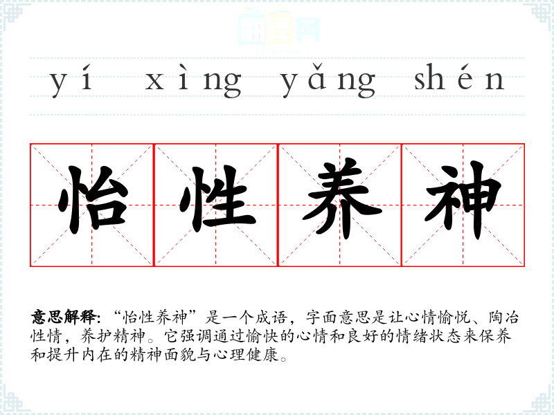 “怡性养神”是一个成语,字面意思是让心情愉悦、陶冶性情,养护精神。它强调通过愉快的心情和良好的情绪状态来保养和提升内在的精神面貌与心理健康。