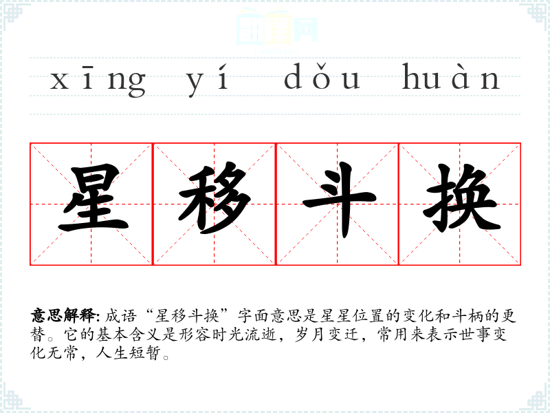 成语“星移斗换”字面意思是星星位置的变化和斗柄的更替。它的基本含义是形容时光流逝,岁月变迁,常用来表示世事变化无常,人生短暂。