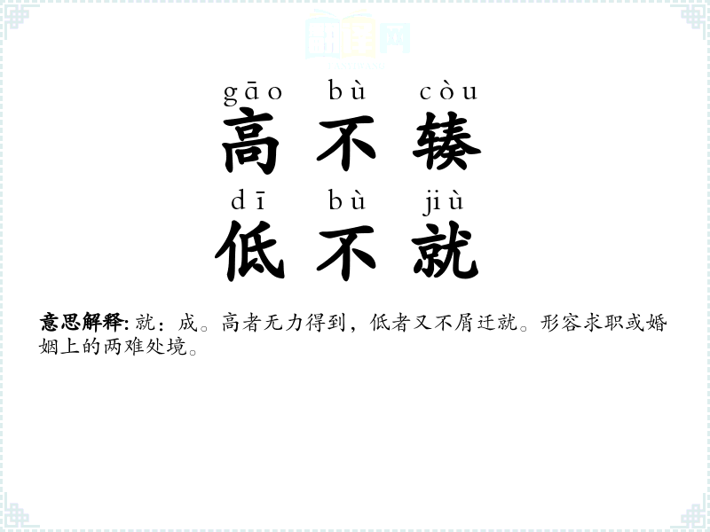 | 高不辏,低不就 | 就:成。高者无力得到,低者又不屑迁就。形容求职或婚姻上的两难处境。 |