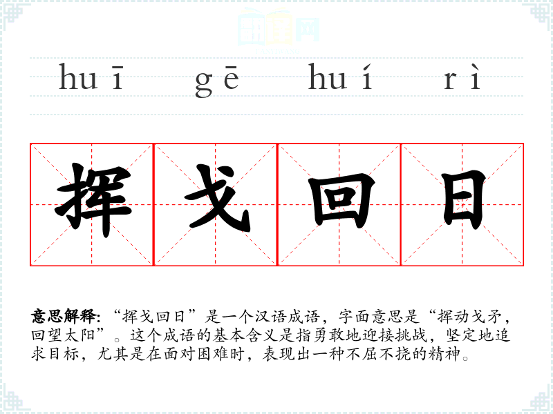 “挥戈回日”是一个汉语成语,字面意思是“挥动戈矛,回望太阳”。这个成语的基本含义是指勇敢地迎接挑战,坚定地追求目标,尤其是在面对困难时,表现出一种不屈不挠的精神。