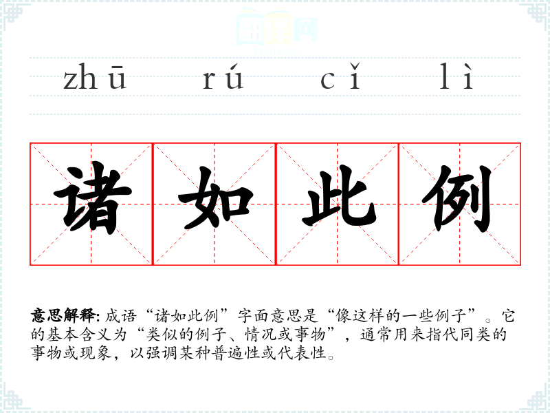 成语“诸如此例”字面意思是“像这样的一些例子”。它的基本含义为“类似的例子、情况或事物”,通常用来指代同类的事物或现象,以强调某种普遍性或代表性。